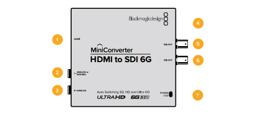Mini Converter SDI to HDMI 6G lets you convert from SDI to HDMI in SD, HD, and Ultra HD formats while de-embeding audio to HDMI, AES/EBU or balanced analog audio.