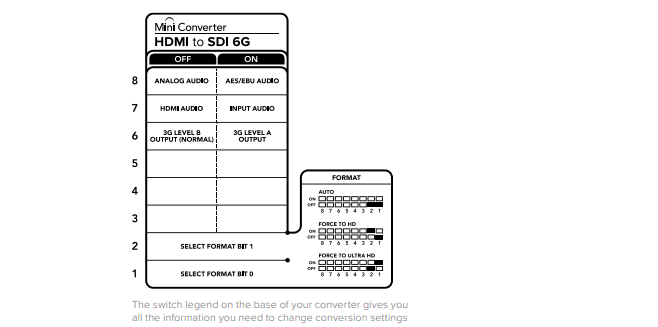 Mini Converter HDMI to SDI 6G’s switches provide the following settings: