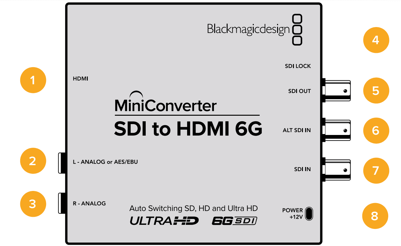 Mini Converter SDI to HDMI 6G lets you convert from SDI to HDMI in SD, HD, and Ultra HD formats while de-embeding audio to HDMI, AES/EBU or balanced analog audio.