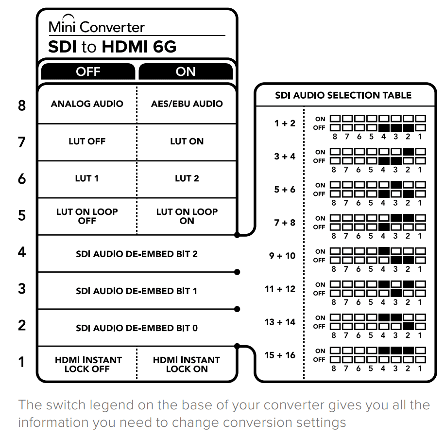 Switches 4, 3 and 2 are grouped together to provide 8 ON/OFF combinations. Having eight different combinations allows eight independent pairs of audio channels to be de-embedded from your SDI input and output to HDMI, analog or AES/EBU audio.