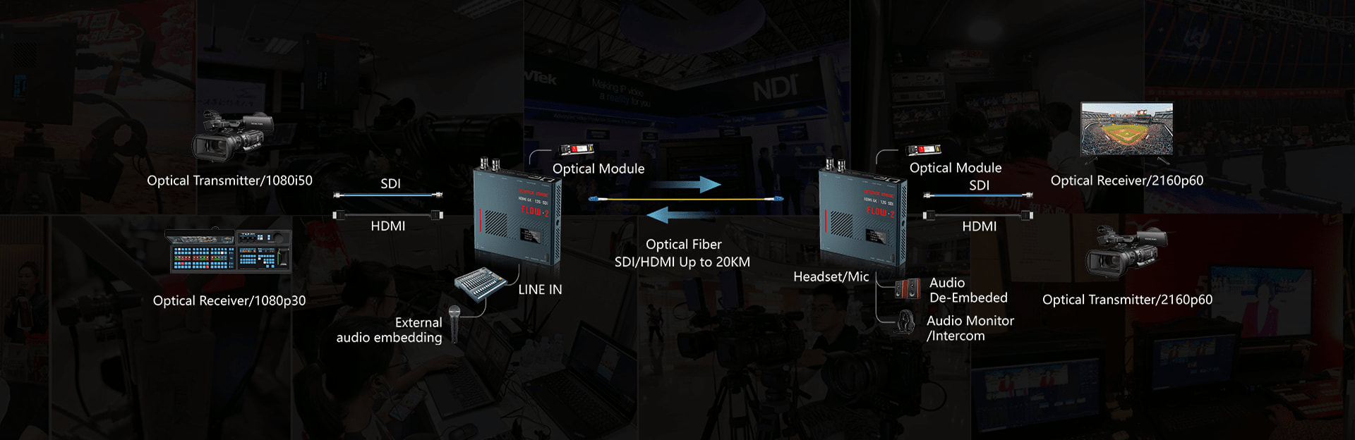 Med 12G SDI-optisk sender og mottaker kan FLOW 2 sende og motta 3G/6G/12G SDI og HDMI 4K-video over opptil 20 km. Via webgrensesnittet velger du mellom SDI- eller HDMI-overføring.