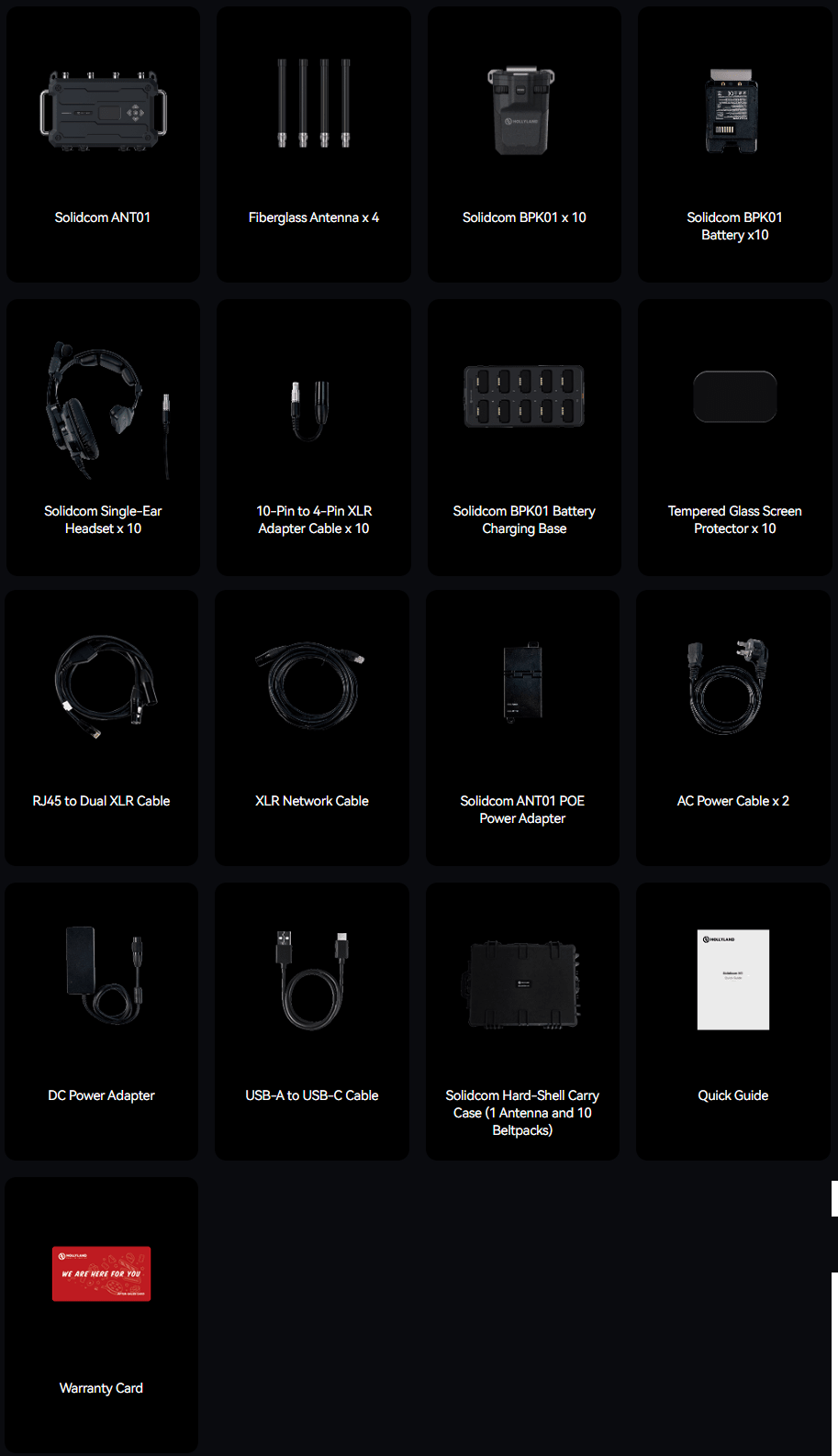Solidcom ANT01, 10 beltpacks med batterier, 10 enkeltsidige hodesett, antenner, ladestasjon, kabler, strømadaptere, bæreveske og tilbehør.