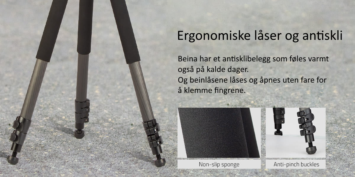 Stativbeina med 3 seksjoner i 8-lags karbonfiber kombinerer lav vekt og høy styrke.