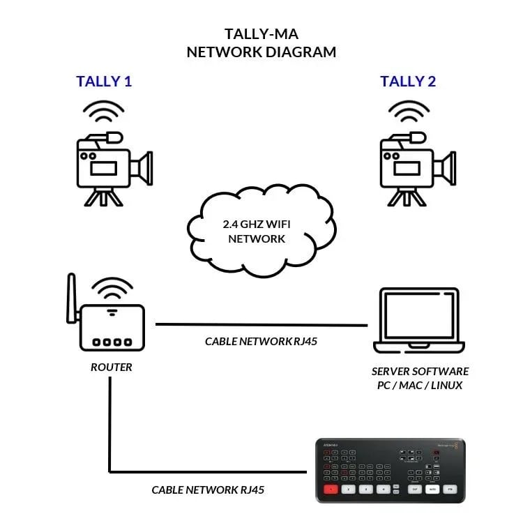 Hver tally må kobles til det samme IPv4-nettverket som produksjonssystemet ditt. Nettverket må ha en 2.4 GHz Wi-Fi-ruter eller et tilgangspunkt som TALLY-MA kan nå. Når talliene er koblet opp, kjører du serverprogramvaren på en maskin i samme nettverk. Der konfigurerer du tilkoblingen mot videosystemet, velger tally-innstillinger – og du er klar.