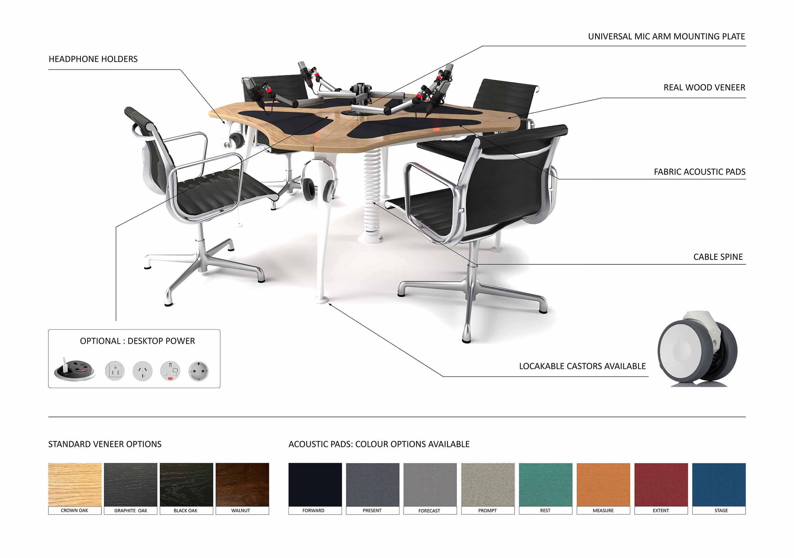 A versatile three- or four-seater conversational desk, the ProVoice V4 features a stylish cast aluminium frame and an optional caster system for easy studio mobility. It includes headphone holders, a cable management spine, universal mic mounting points, and is available in a range of colours and finishes.